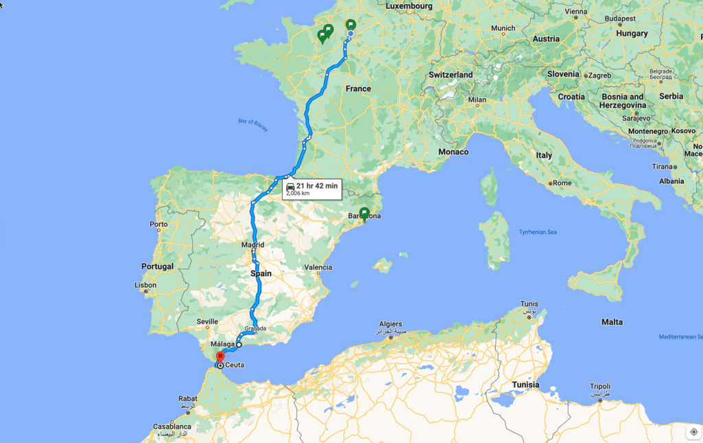 How: Not many possibilities are available, so we are choosing the “fastest” one; take the ferry at Gilbartar. To do so, we will put the bike on a car trailer and drive from Paris to Malaga (1800km) as fast as possible. We will leave the car and the trailer there and take bikes to Gilbartar where we will take the ferry to Ceuta.